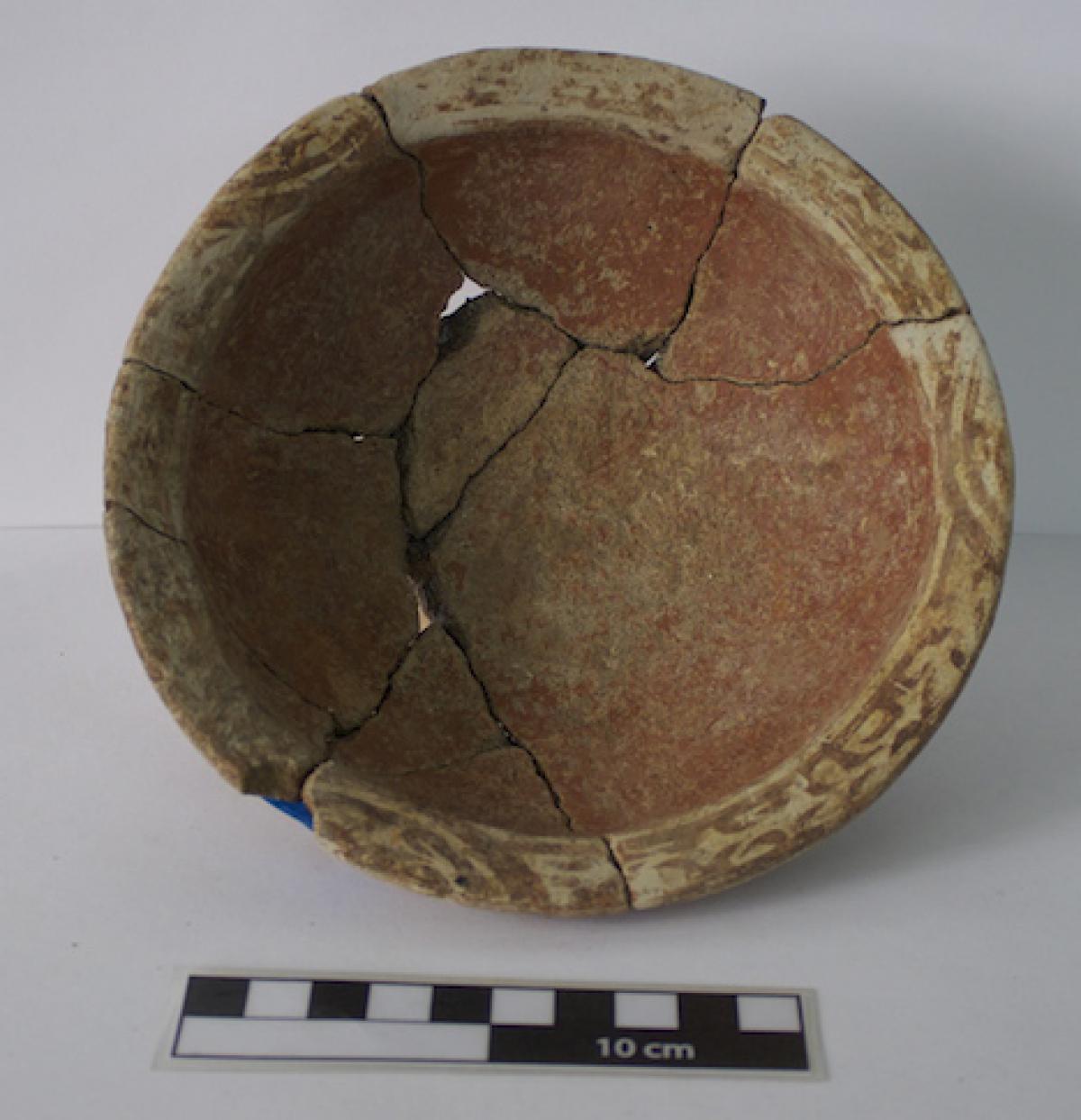 3658 - Cuenco de base plana, paredes ligeramente convexas y borde engrosado hacia el exterior, con engobe rojo externo y blanco interno, decorado con un panel central con la representación de un (...