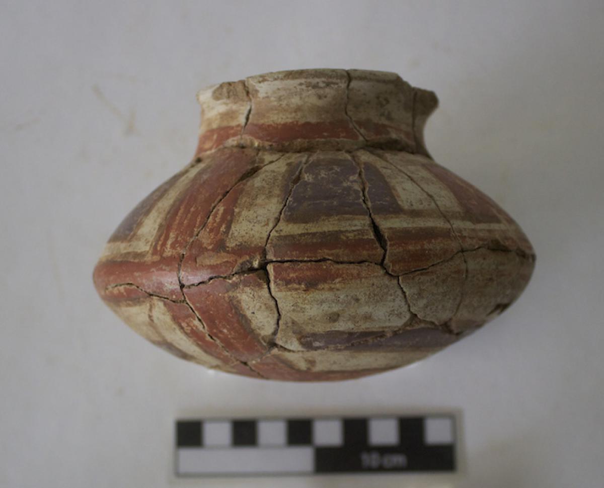 376 - Jarra polícroma carenada con hombros alzados y cuello largo. Engobe blanco y decoración de bandas de color alternas rojas y moradas.