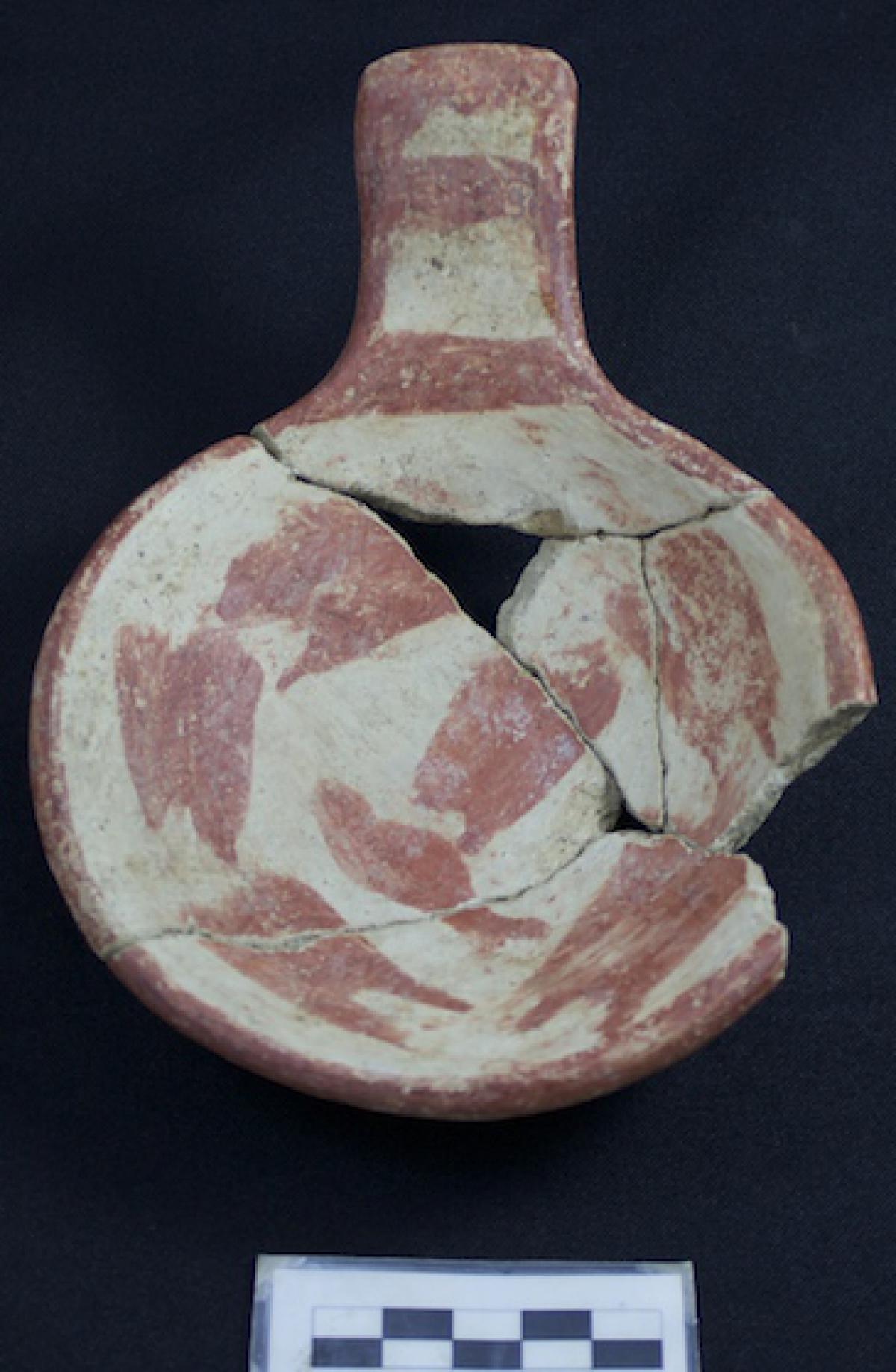 3565 - Jarra globular con base anular, cuello largo y borde recto. Engobe de color rojo en el exterior y engobe de color blanco sobre el cuello. Banda de color morado sobre el cuello.