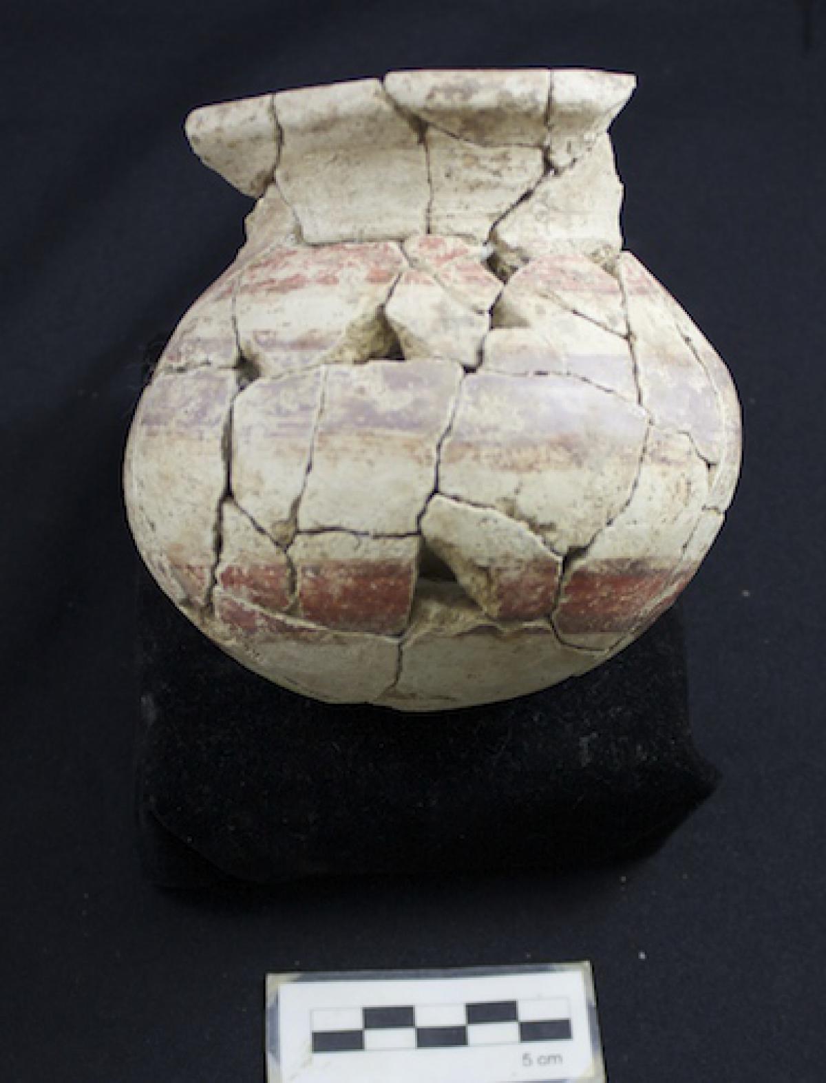 3565 - Jarra globular con base anular, cuello largo y borde recto. Engobe de color rojo en el exterior y engobe de color blanco sobre el cuello. Banda de color morado sobre el cuello.