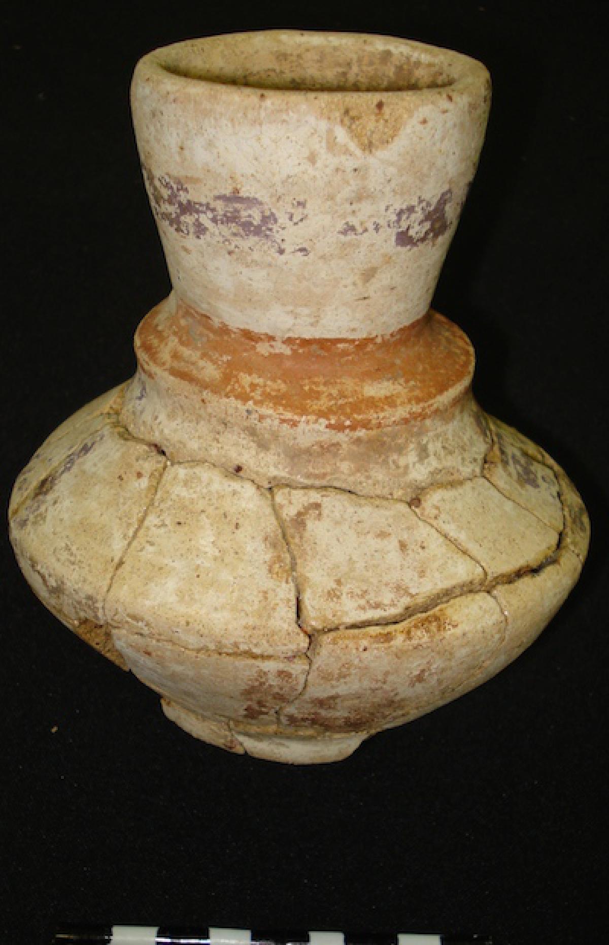 3565 - Jarra globular con base anular, cuello largo y borde recto. Engobe de color rojo en el exterior y engobe de color blanco sobre el cuello. Banda de color morado sobre el cuello.