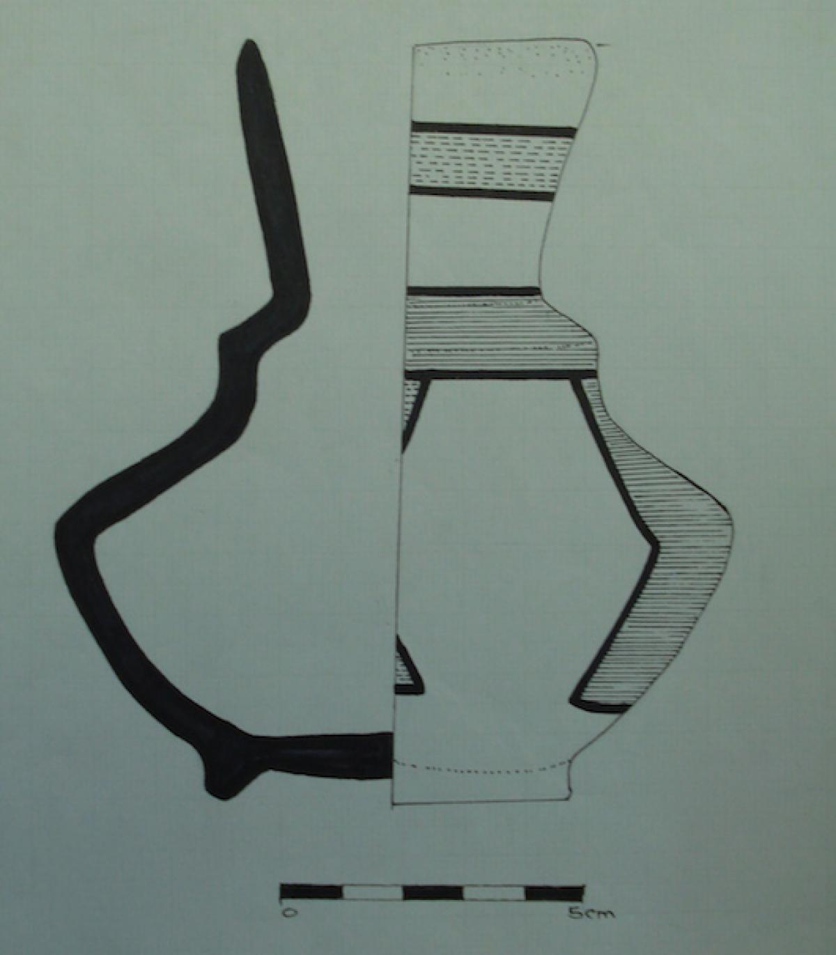 376 - Jarra polícroma carenada con hombros alzados y cuello largo. Engobe blanco y decoración de bandas de color alternas rojas y moradas.