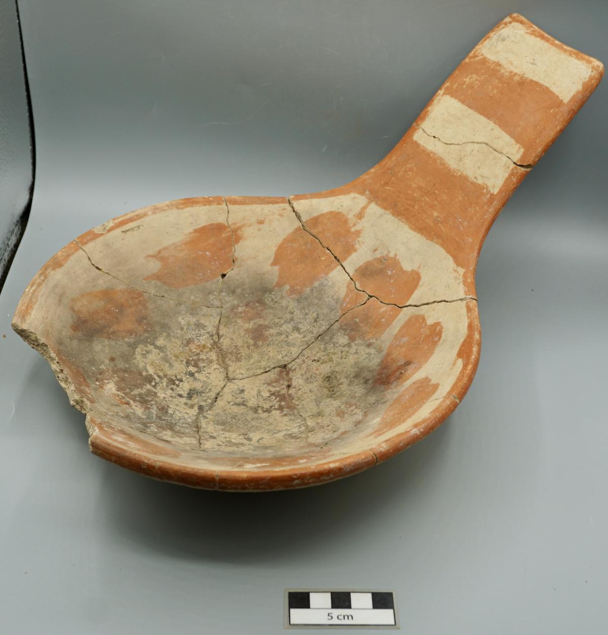Incensario bípedo en forma de cuenco semiesférico y con asa plana rectangular. Engobe de color crema en el interior y superficie sin engobe en el exterior. Decoración de bandas de color rojo y motivos similares a gotas sin color de contorno.