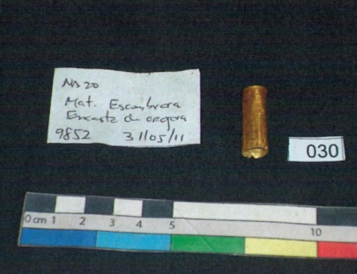 0,2%(Cu), 5,5%(Ag), 94,3%(Au) - 0,2%(Cu), 5,6%(Ag), 94,2%(Au) y madera..(1)
