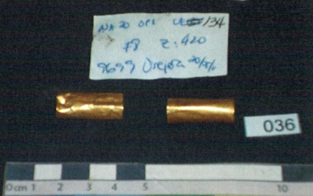 0,2%(Cu), 5,5%(Ag), 94,3%(Au) - 0,2%(Cu), 5,6%(Ag), 94,2%(Au) y madera..(1)