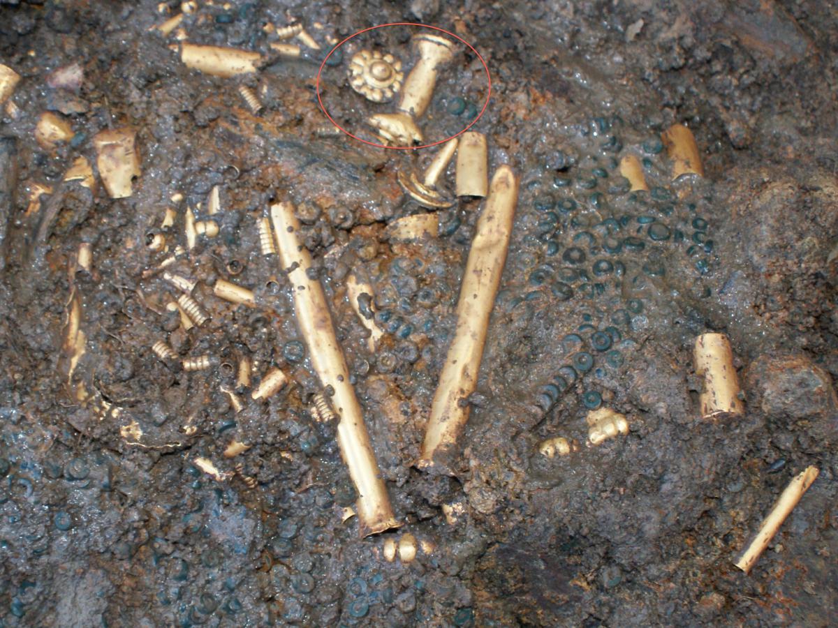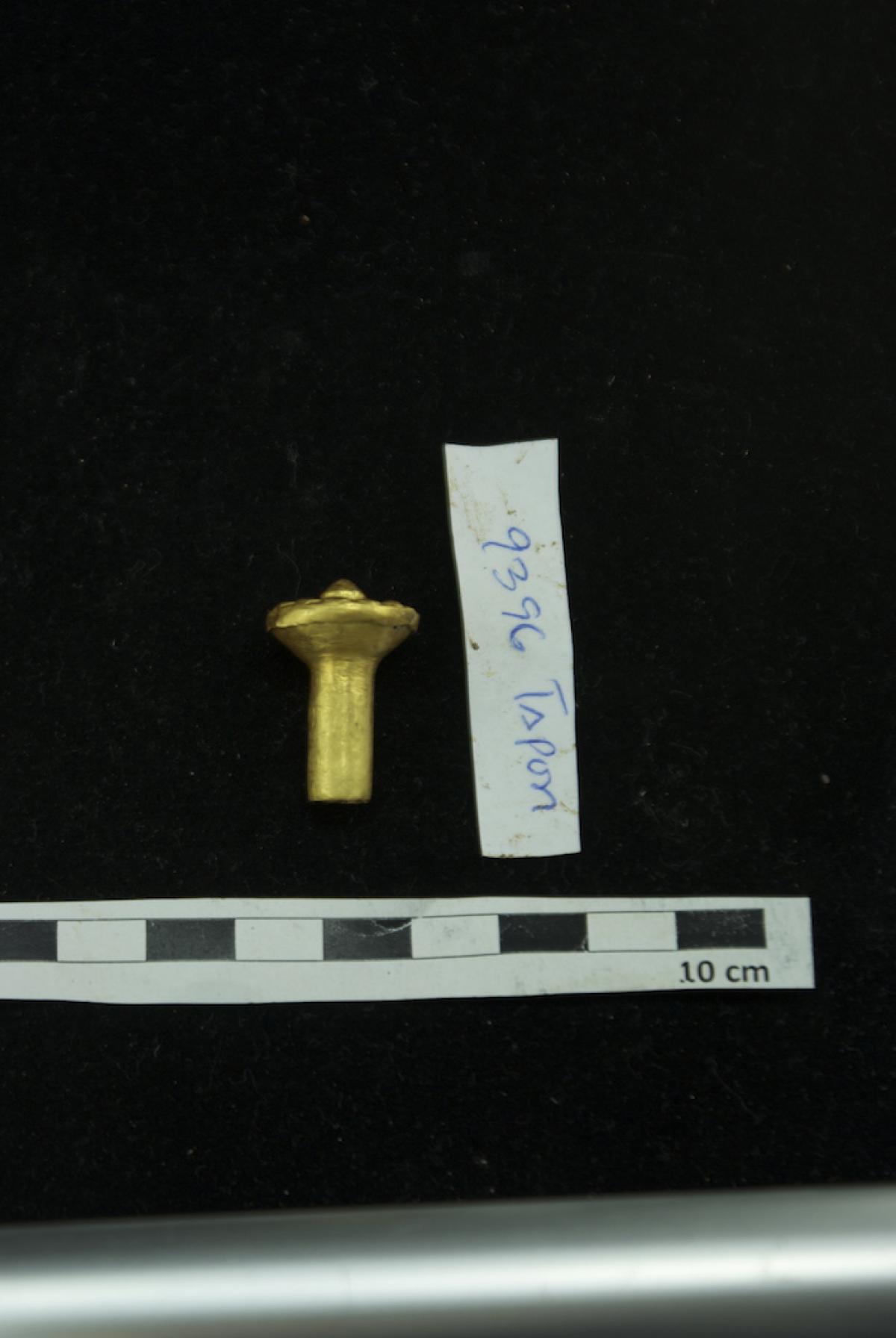 377 - Pendiente figurativo de oro fundido con la representación de un murciélago bicéfalo en vuelo que formaba parte del ajuar del individuo I5 de la tumba T2. EL aro de suspensión se localiza...