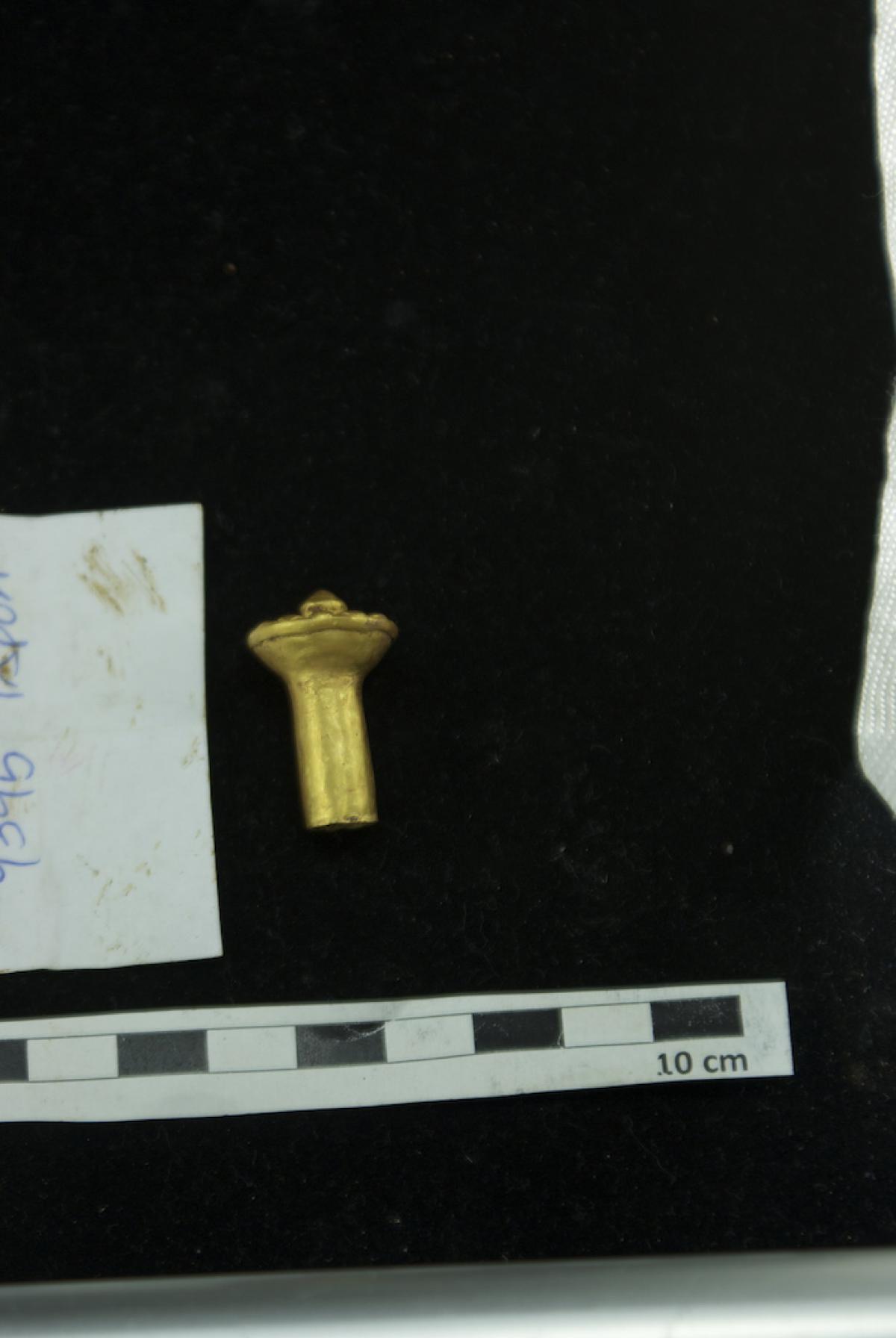 377 - Pendiente figurativo de oro fundido con la representación de un murciélago bicéfalo en vuelo que formaba parte del ajuar del individuo I5 de la tumba T2. EL aro de suspensión se localiza...