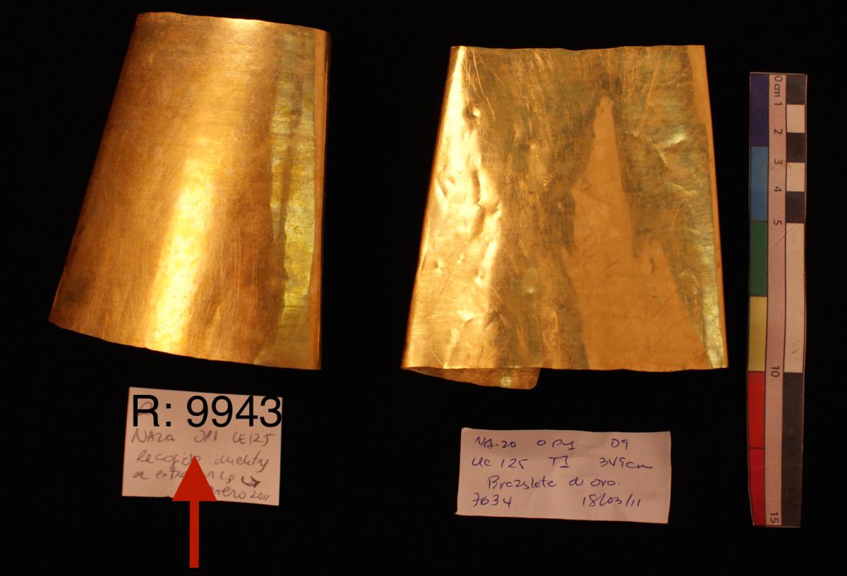 387 - Pectoral de oro martillado repujado con la representación frontal del rostro de un ser sobrenatural con rasgos de un anciano que formaba parte del ajuar del Individuo 20, un infante, de la ...