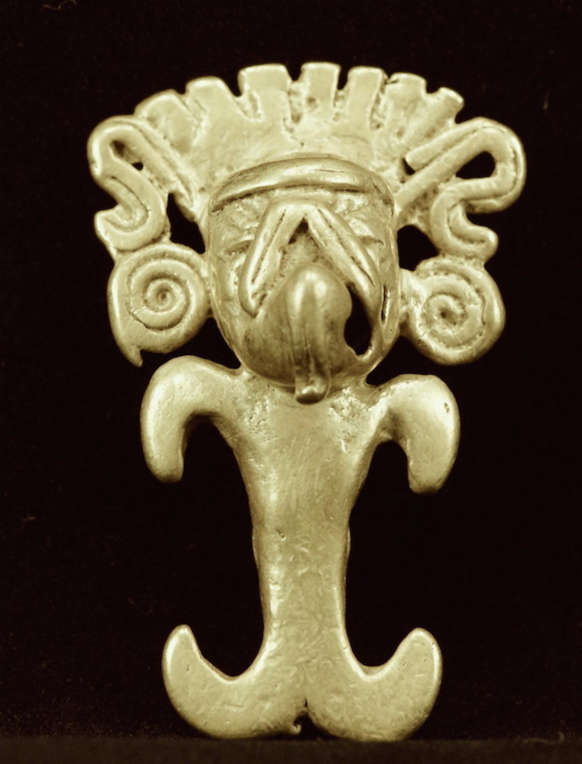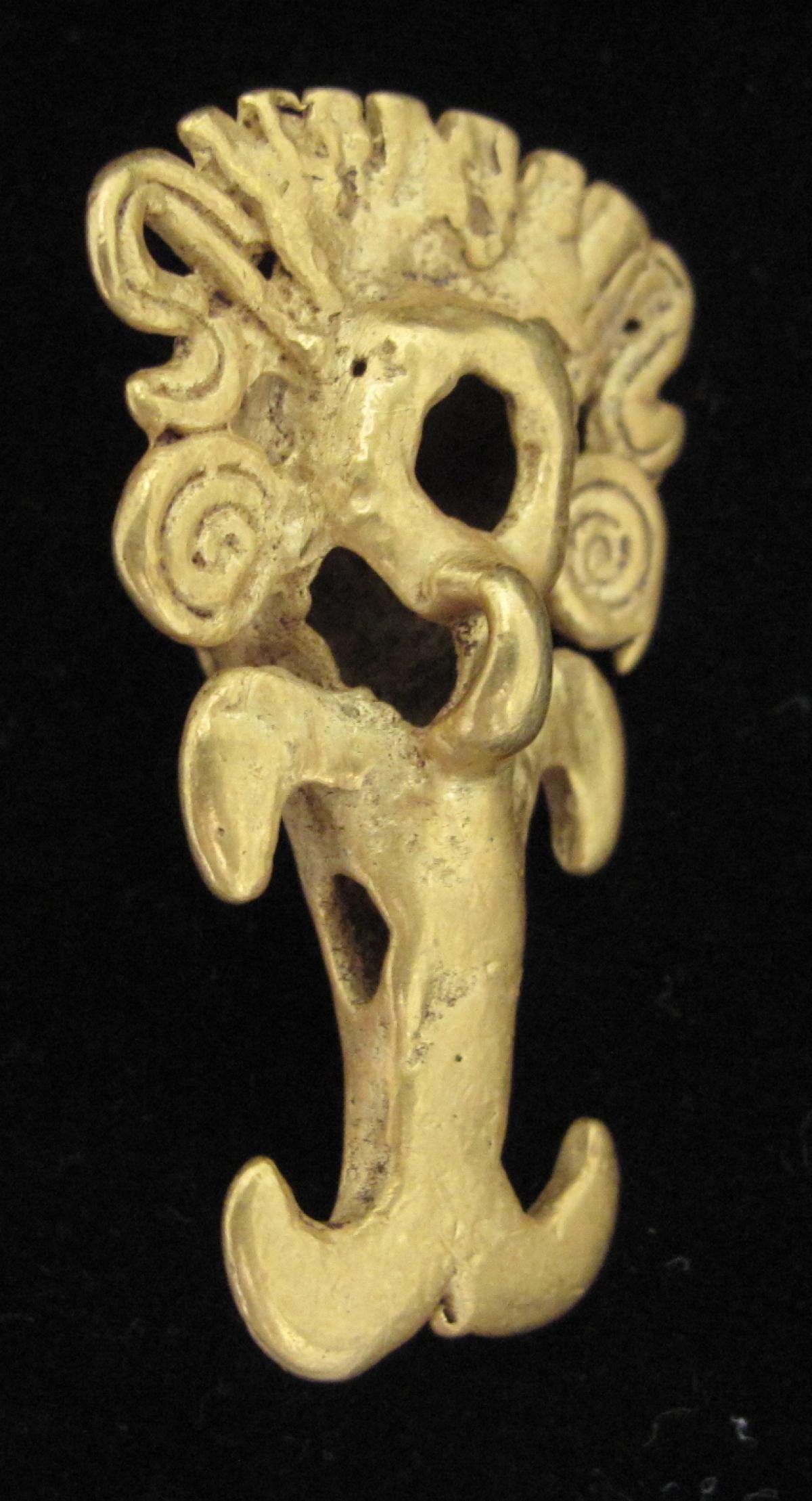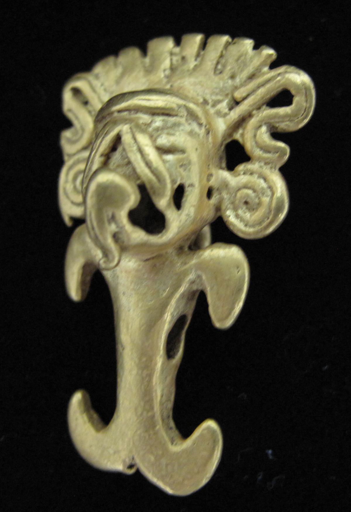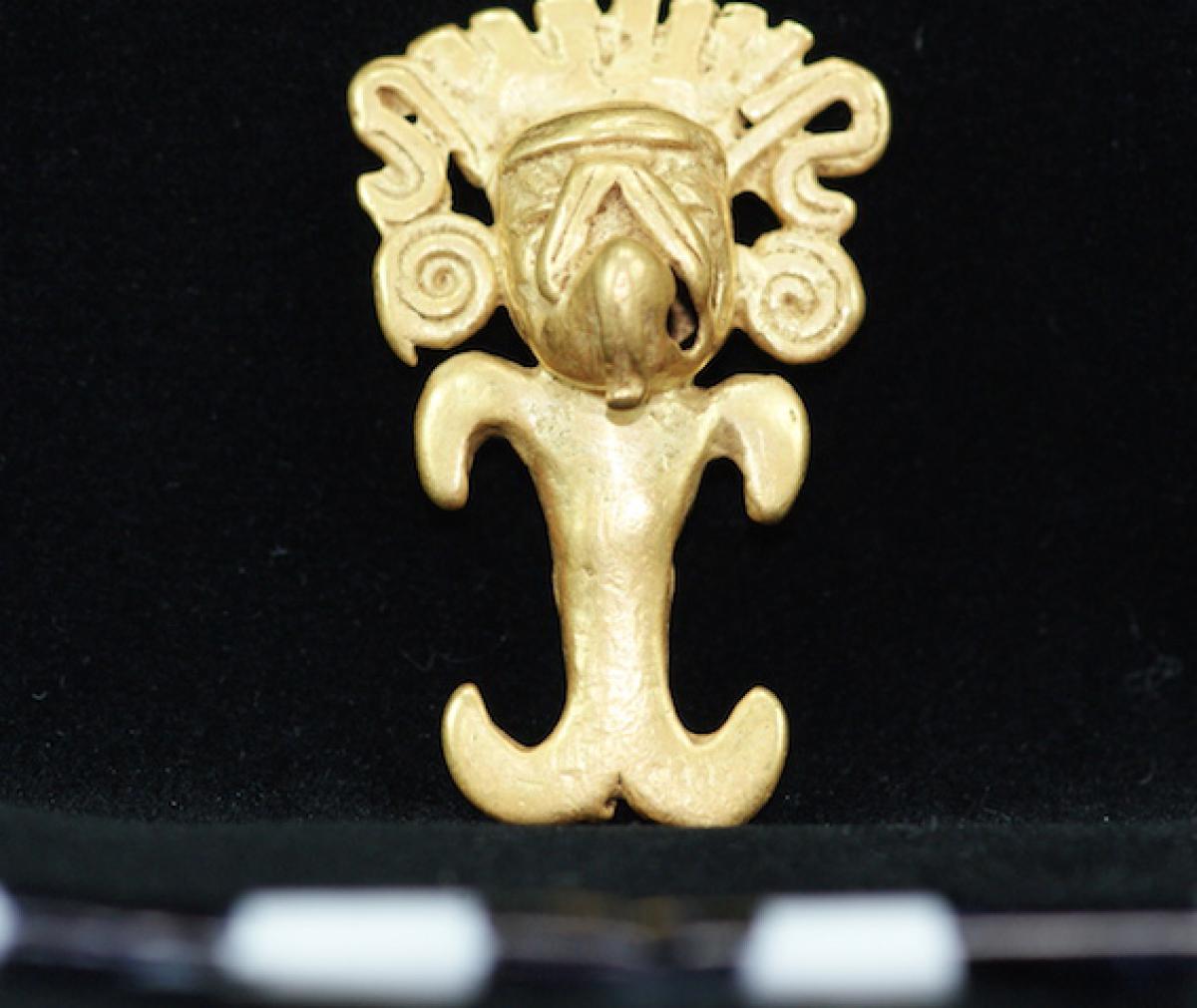 Vista frontal del pendiente figurativo de oro fundido 9897, parte del ajuar del individuo principal de la Tumba T6. 4,1 x 2,6 cm. Estilo Internacional.