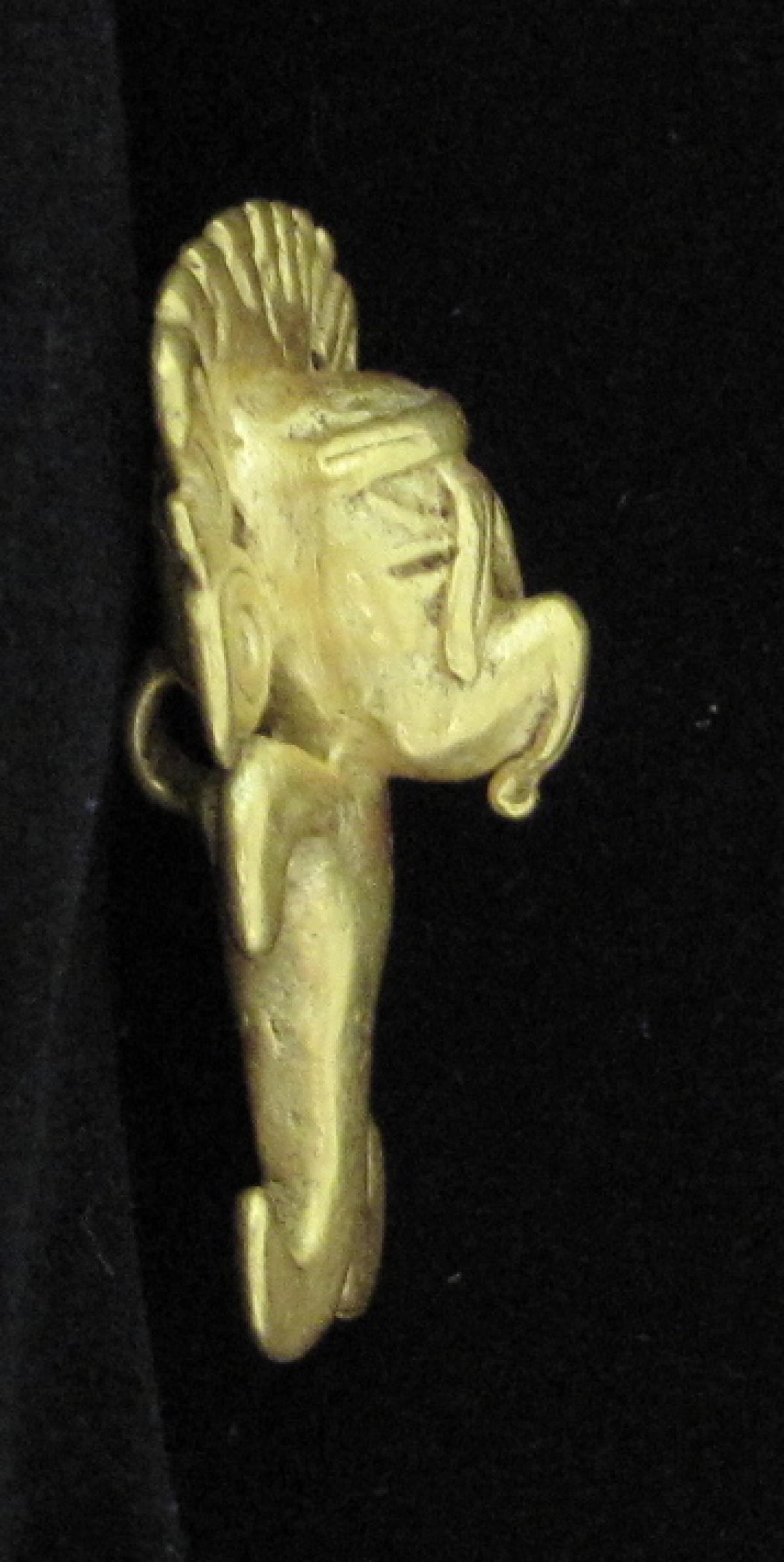 Vista lateral derecha del pendiente figurativo de oro fundido 9897, parte del ajuar del individuo principal de la Tumba T6. 4,1 x 2,6 cm. Estilo Internacional.