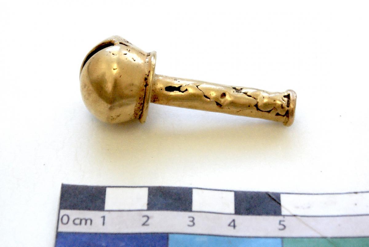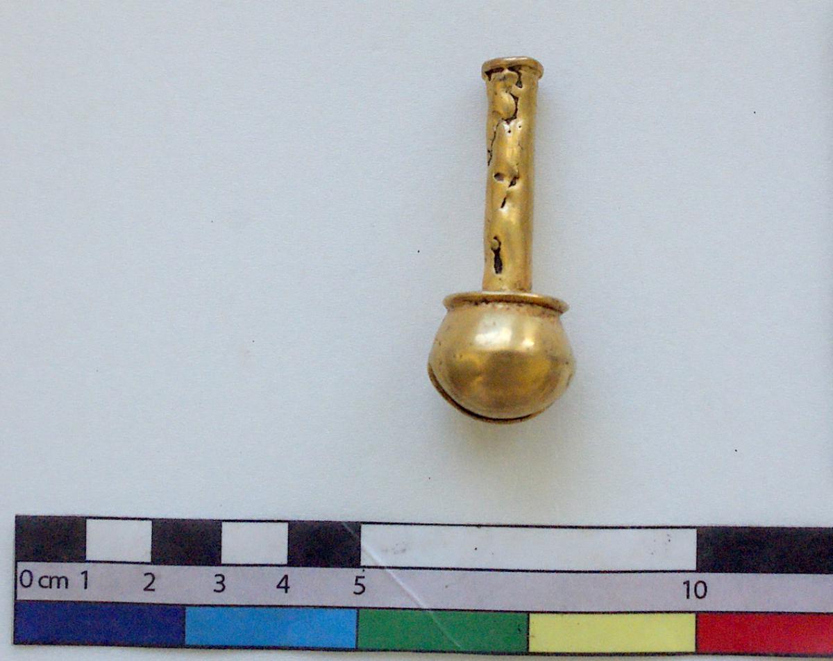 377 - Pendiente figurativo de oro fundido con la representación de un murciélago bicéfalo en vuelo que formaba parte del ajuar del individuo I5 de la tumba T2. EL aro de suspensión se localiza...