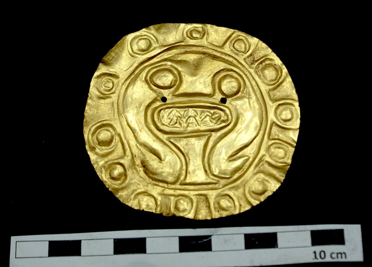 387 - Pectoral de oro martillado repujado con la representación frontal del rostro de un ser sobrenatural con rasgos de un anciano que formaba parte del ajuar del Individuo 20, un infante, de la ...