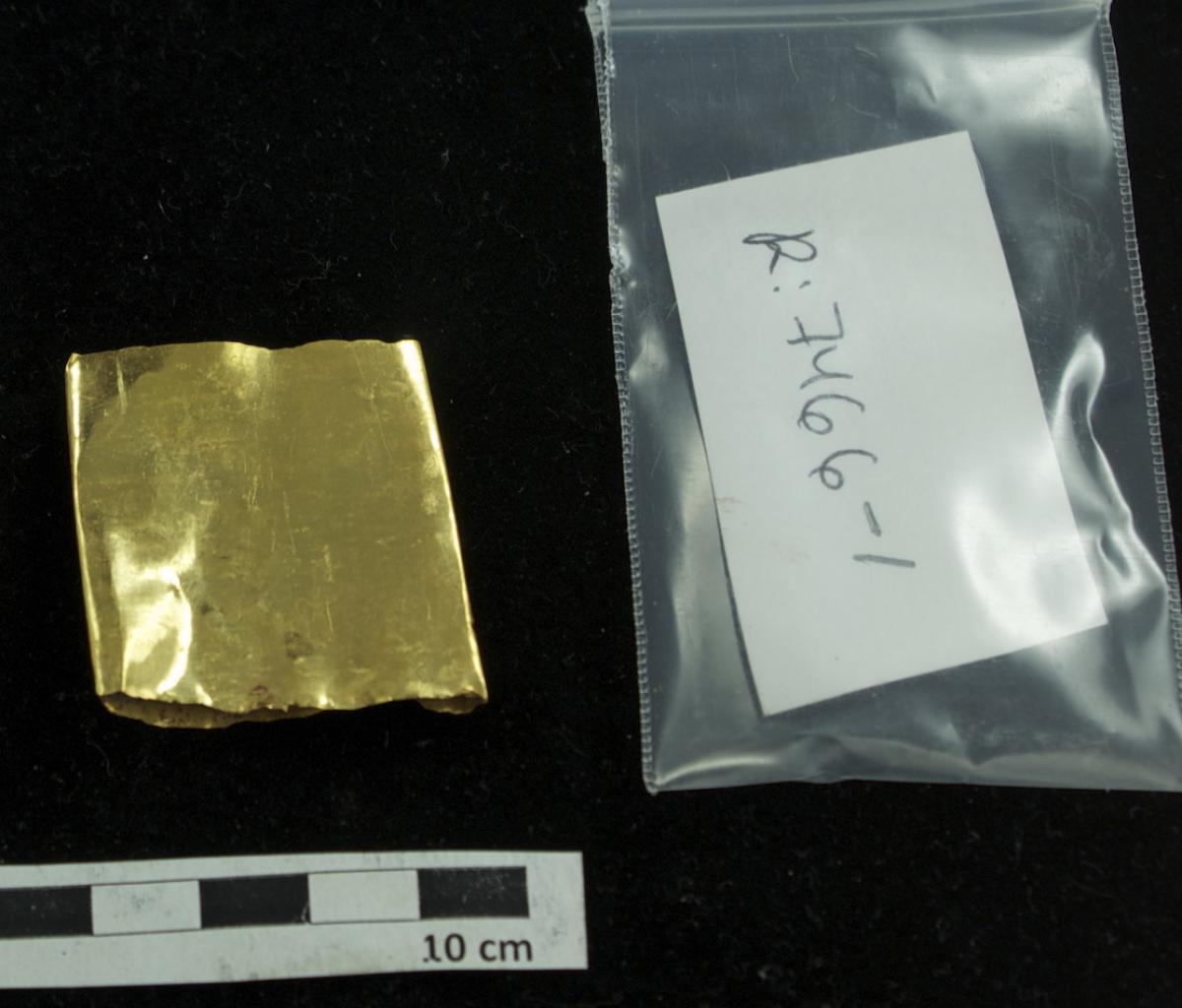 0,2%(Cu), 5,5%(Ag), 94,3%(Au) - 0,2%(Cu), 5,6%(Ag), 94,2%(Au) y madera..(1)