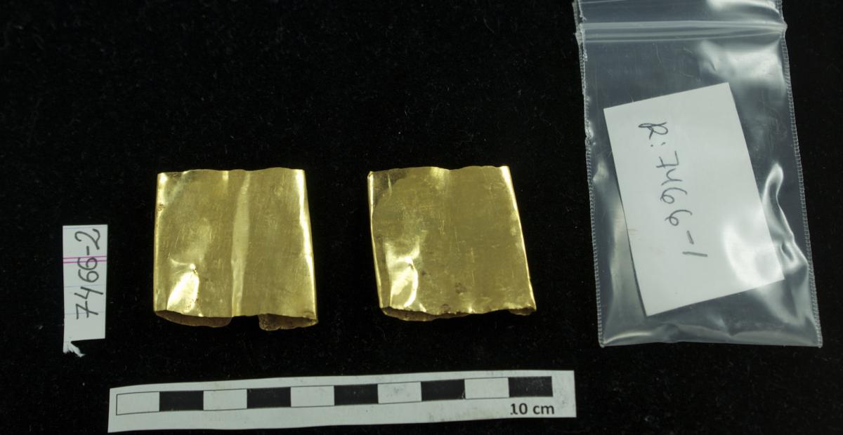 377 - Pendiente figurativo de oro fundido con la representación de un murciélago bicéfalo en vuelo que formaba parte del ajuar del individuo I5 de la tumba T2. EL aro de suspensión se localiza...
