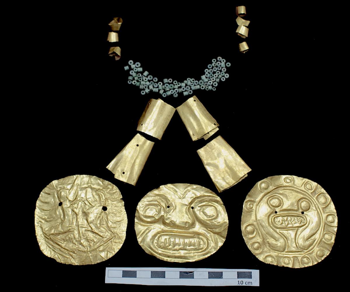 387 - Pectoral de oro martillado repujado con la representación frontal del rostro de un ser sobrenatural con rasgos de un anciano que formaba parte del ajuar del Individuo 20, un infante, de la ...