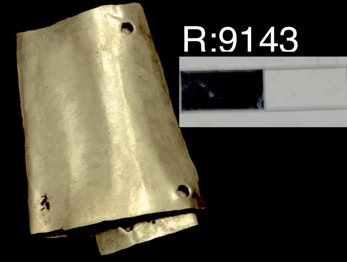 Pequeño brazalete de oro perteneciente al ajuar del individuo I20 de la tumba T2. Lleva cuatro orificios para introducir los elementos de atado.