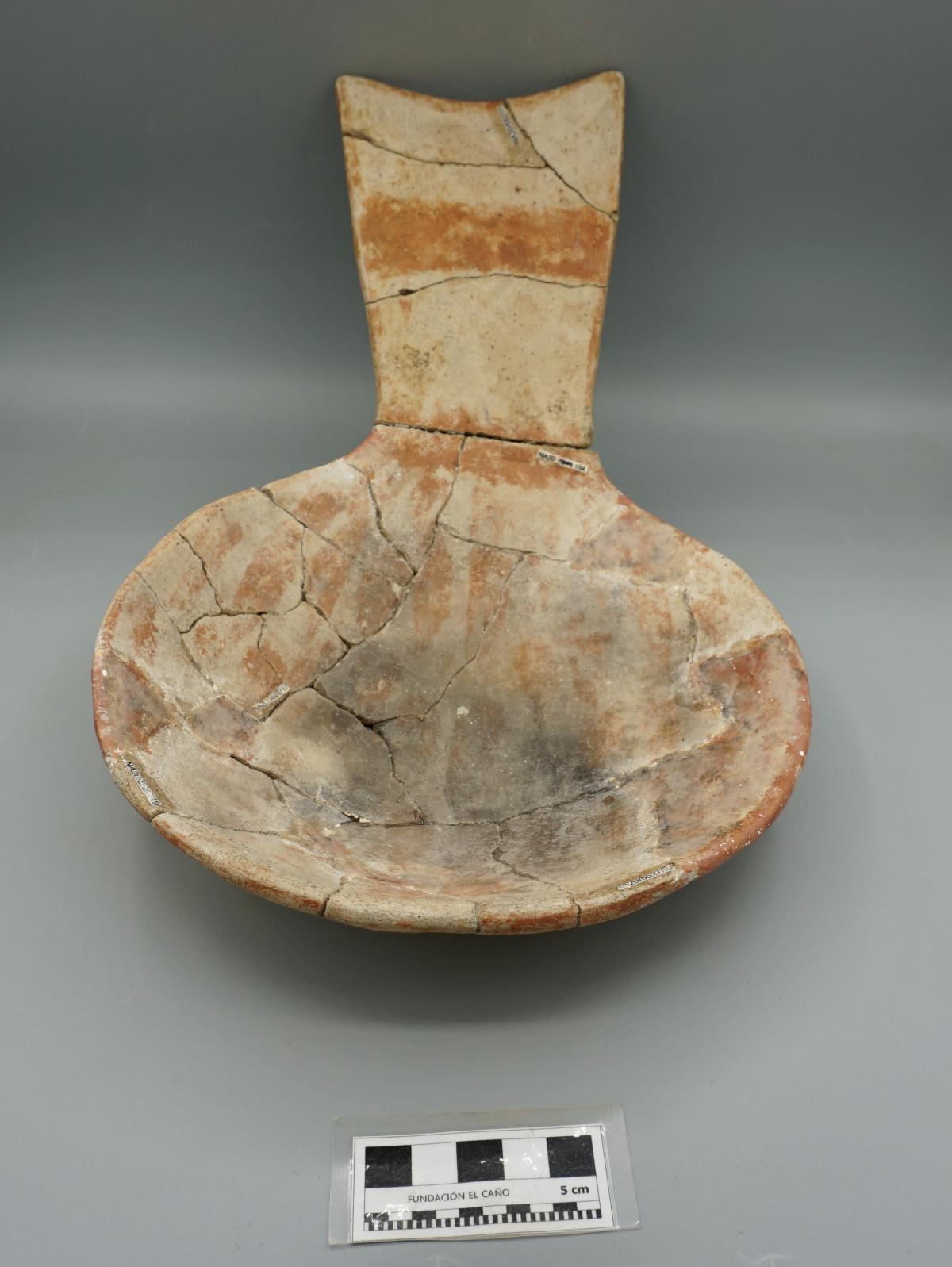 Sahumerio o incensario bípedo de asa plana y rectangular. Engobe de color crema y decoración a base de gotas y bandas de color rojo. Presenta huellas de uso. Parcialmente restaurado.