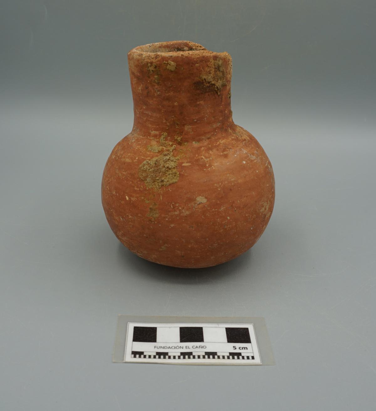 Olla con borde envesado, con línea roja y asa en el cuerpo, sin soporte.